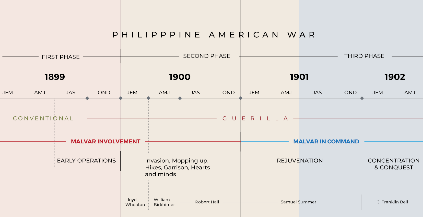 In his paper External Discipline during Conterinsurgency: A Philippine War Case Study, 1900—1901., John S. Reed asserts that military operations during the Philippine-American War moved through three distinct phases